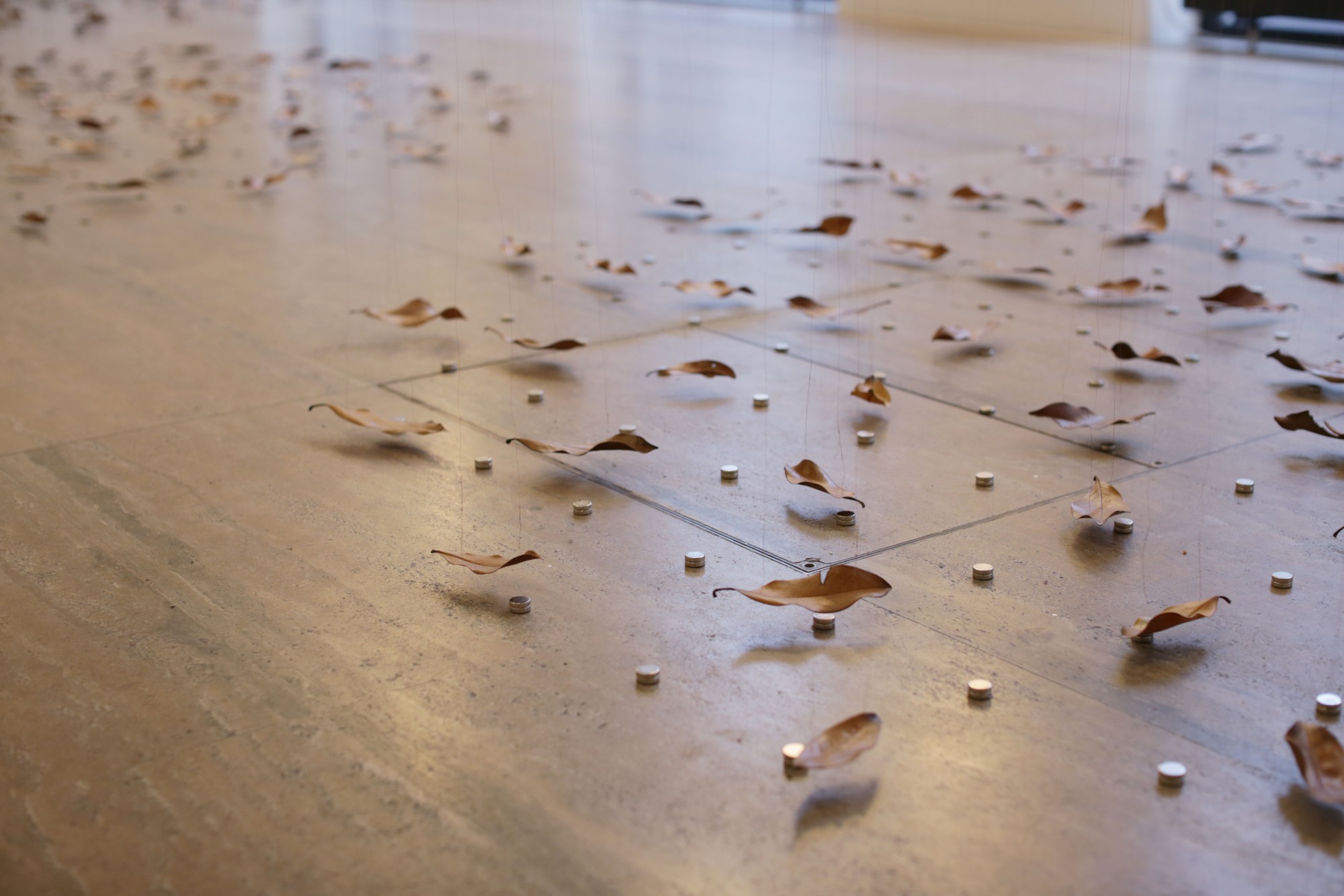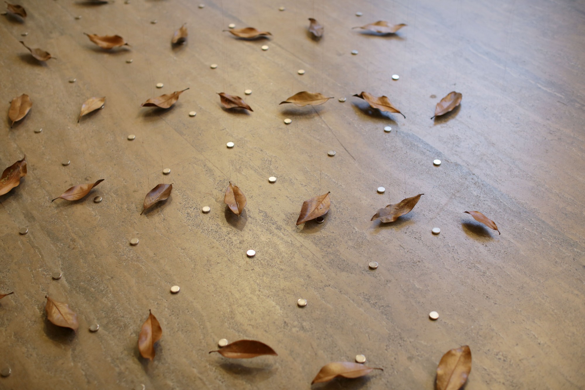 Elles effectuent des lentes rotations à vitesse fixe. De ces rosaces tombent des fils de cuivre fins. Au bout de chaque fil est suspendue une feuille séchée de Magnolia Grandiflora. Le fil traverse chaque feuille de part et d'autre par une couture. Les feuilles sont suspendues horizontalement, frôlant le sol et les aimants qui y sont placés.