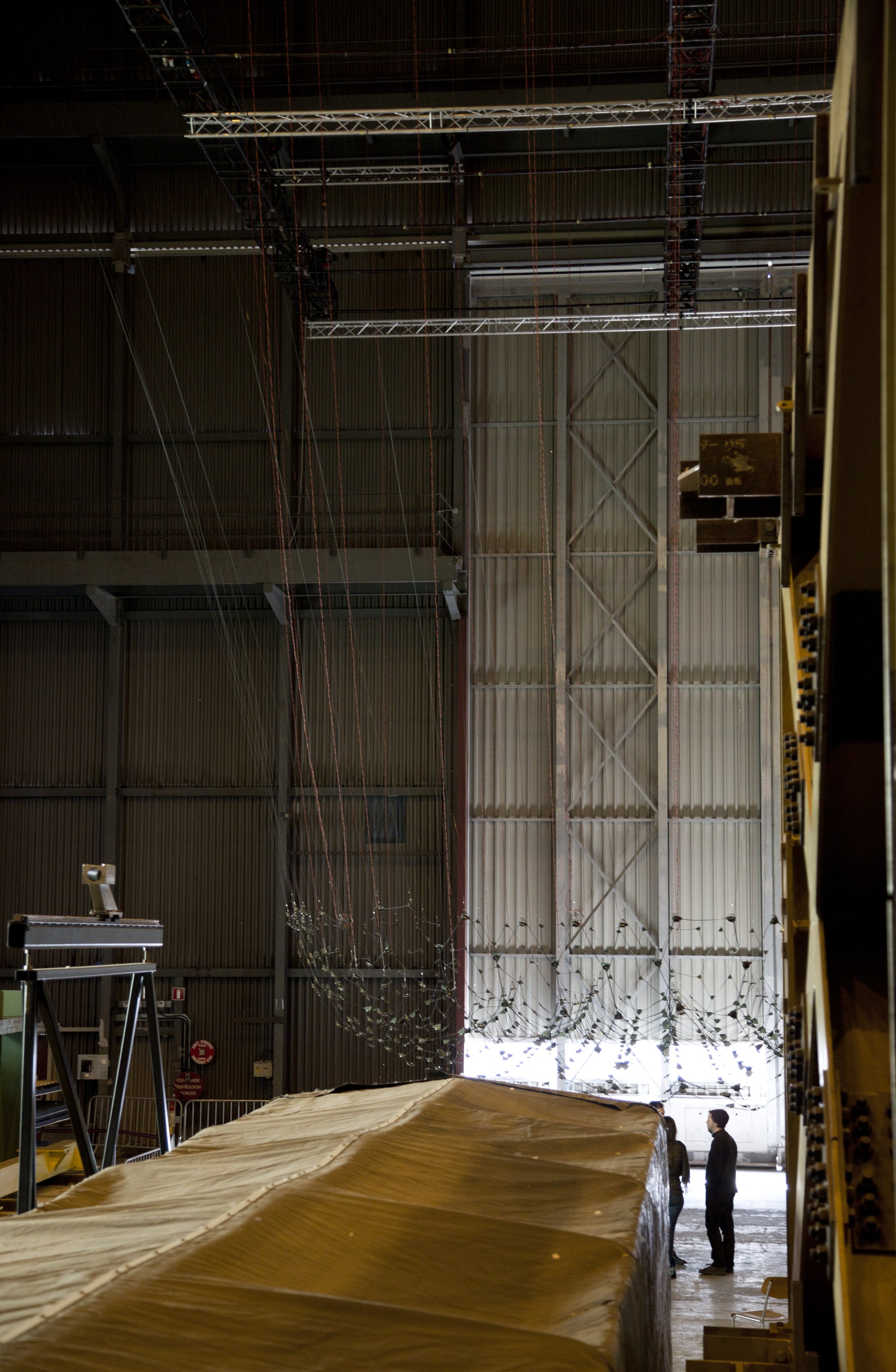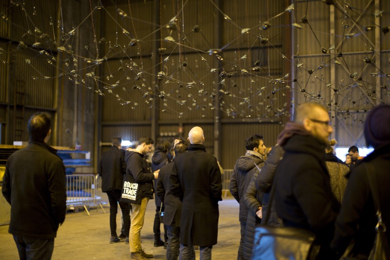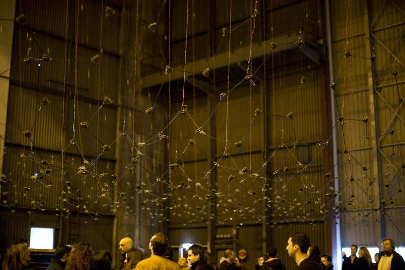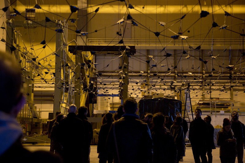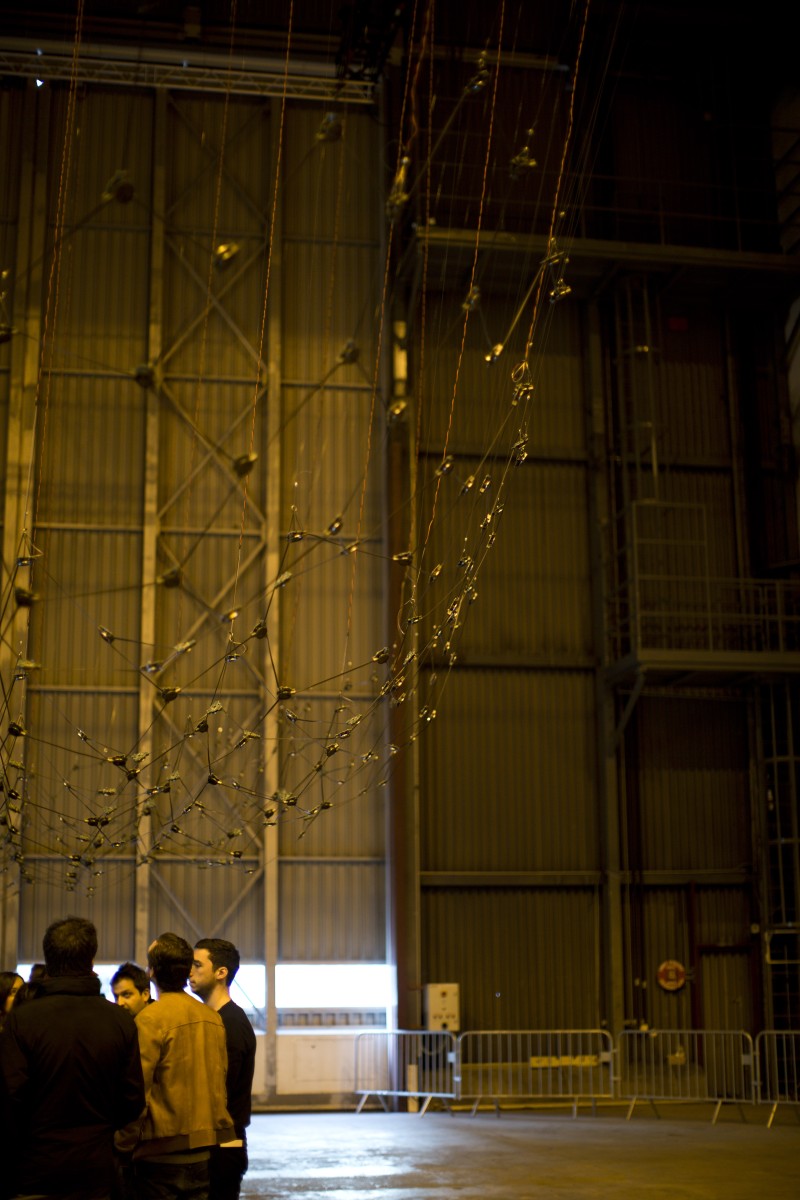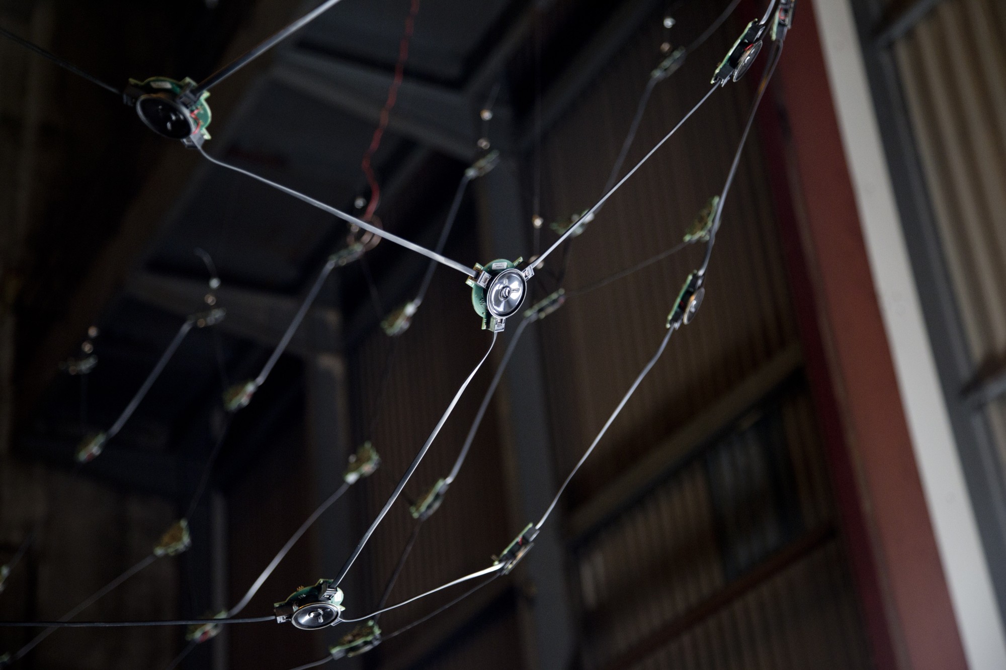 L’installation tente d’aborder la multiplicité des sources d’une manière pointilliste, sans élément maître. Une source sonore comme un individu dans la masse, un point dans l’espace, une maille dans un filet, un reflet brillant dans l’océan. Un individu autonome possédant ses paramètres propres, évoluant au sein d’un tout.