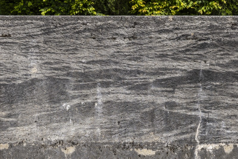 Procédant par effacement de lichens, à l'aide d'une trame de demi-teinte, l'intervention fait apparaître au mur une large image de vagues en pleine mer.