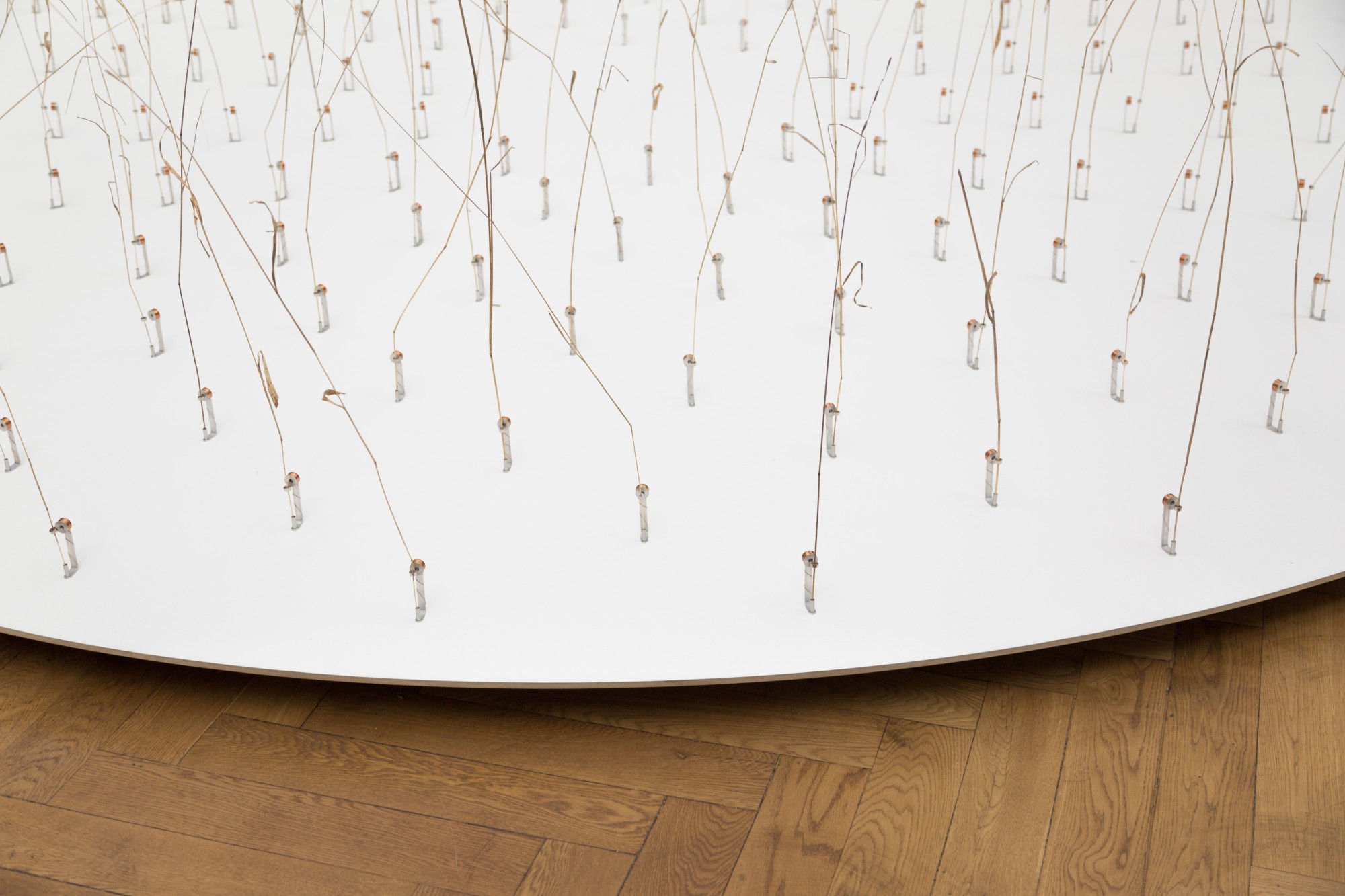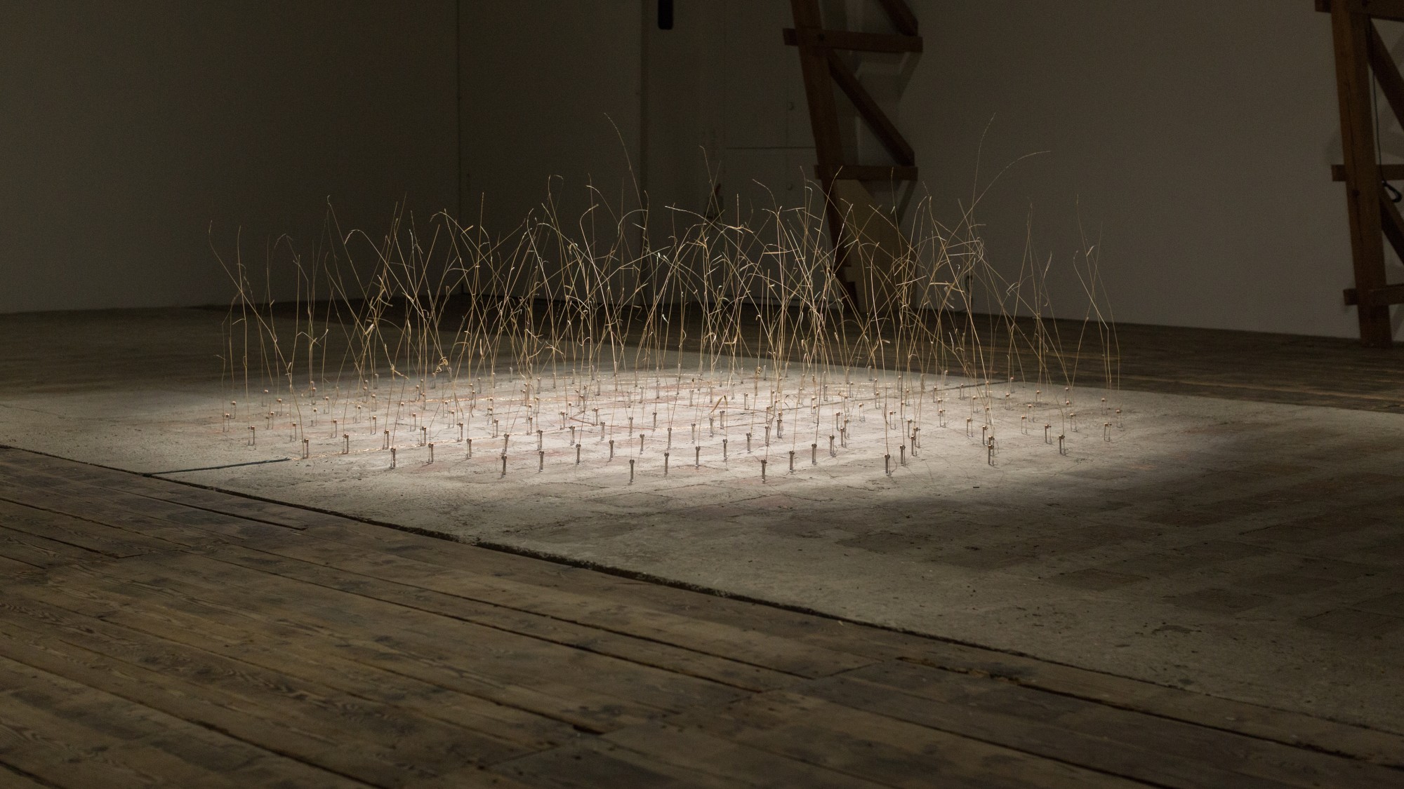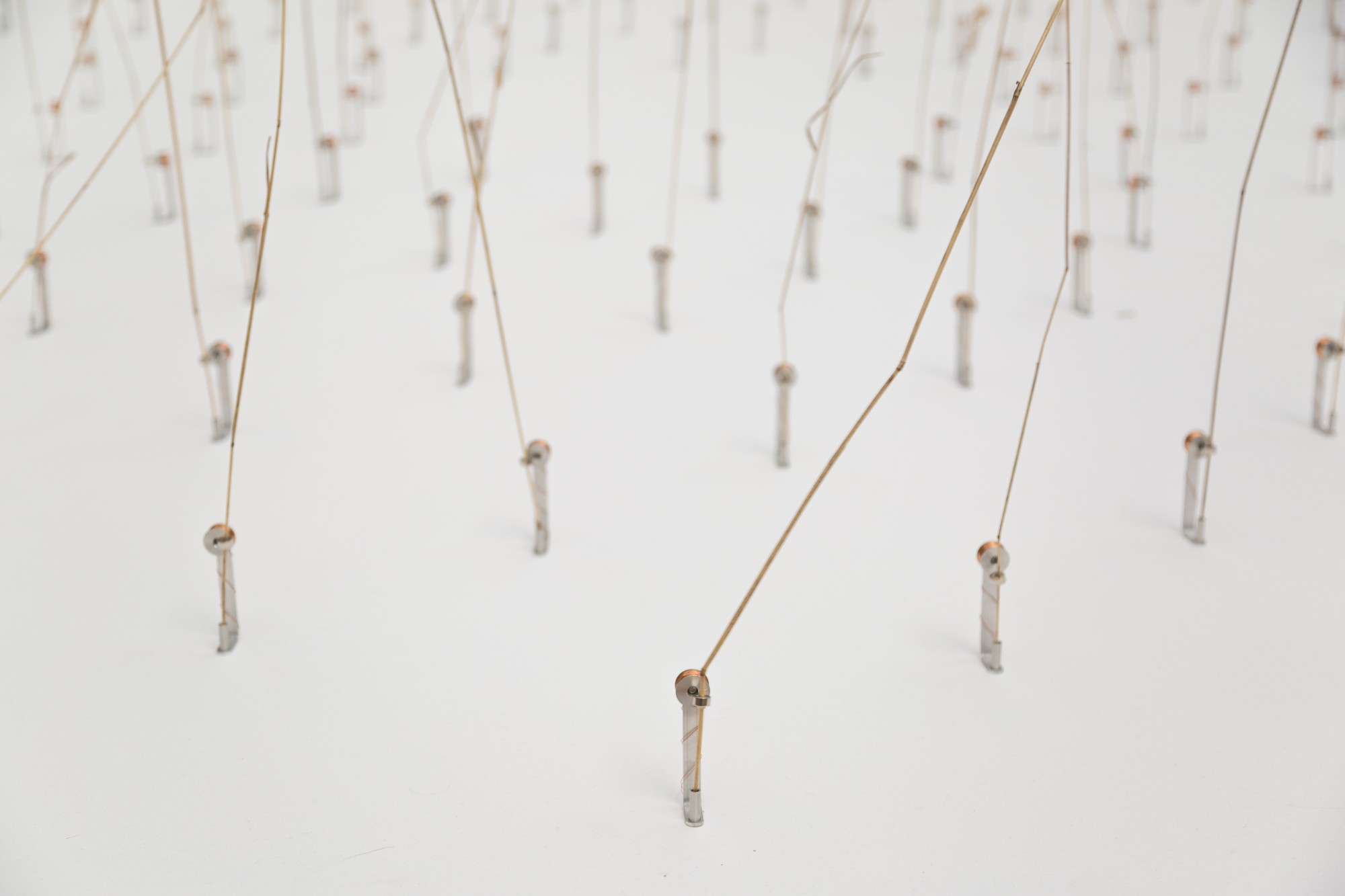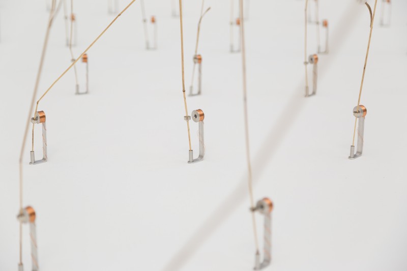 Ce sont 162 brindilles d’herbes hautes qui sont mises en vibrations aléatoires par un système électromagnétique simple. La base est faite d’une bobine de fil de cuivre, et la tige est montée d’un aimant cylindrique.