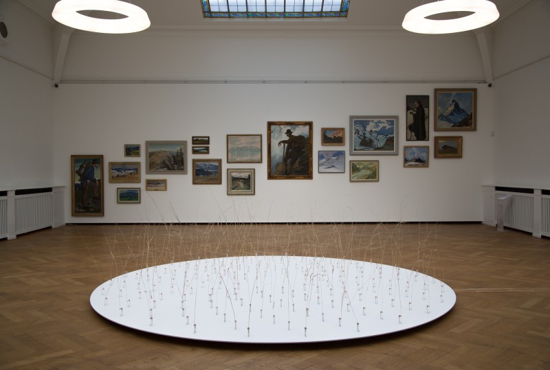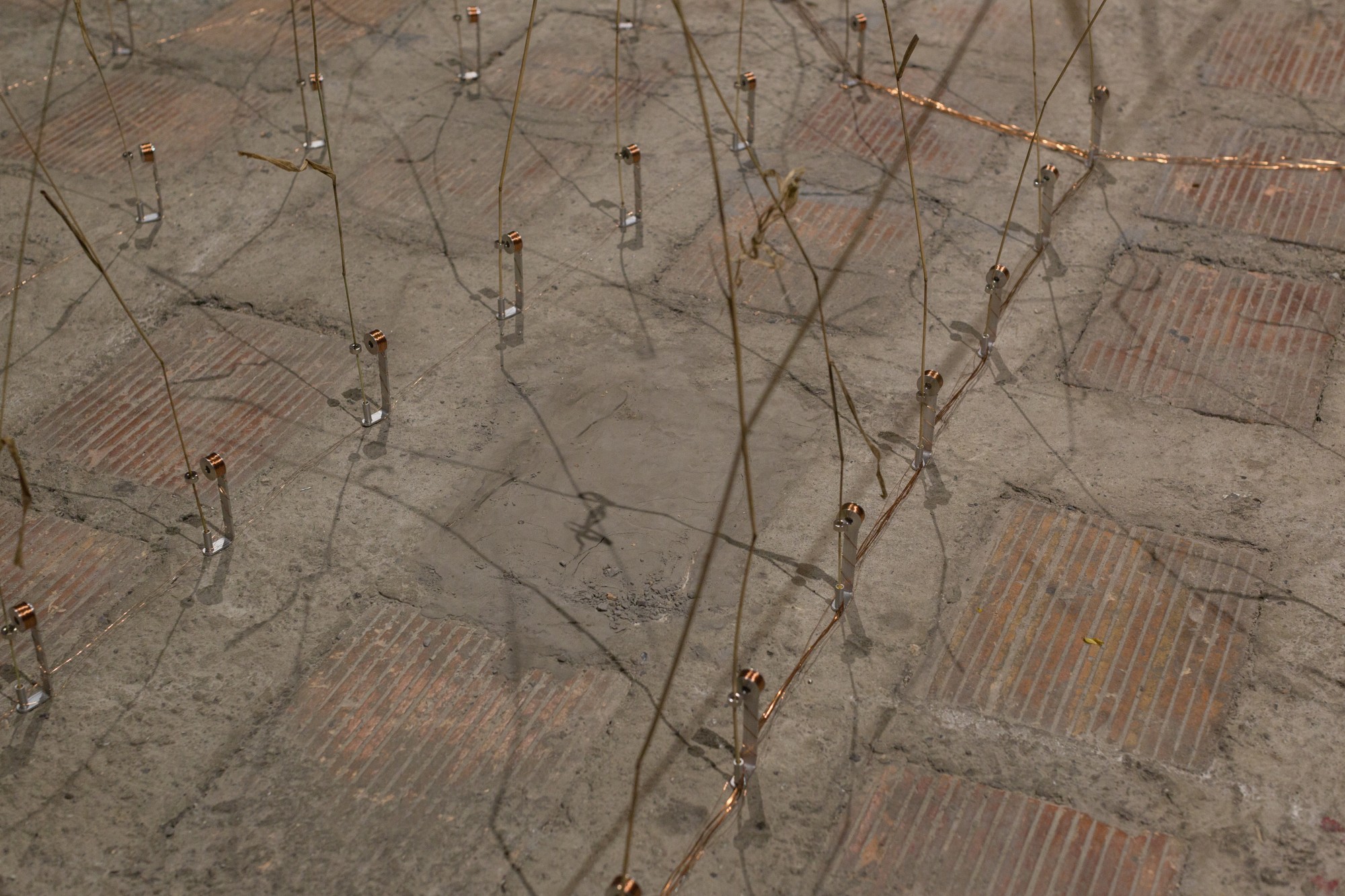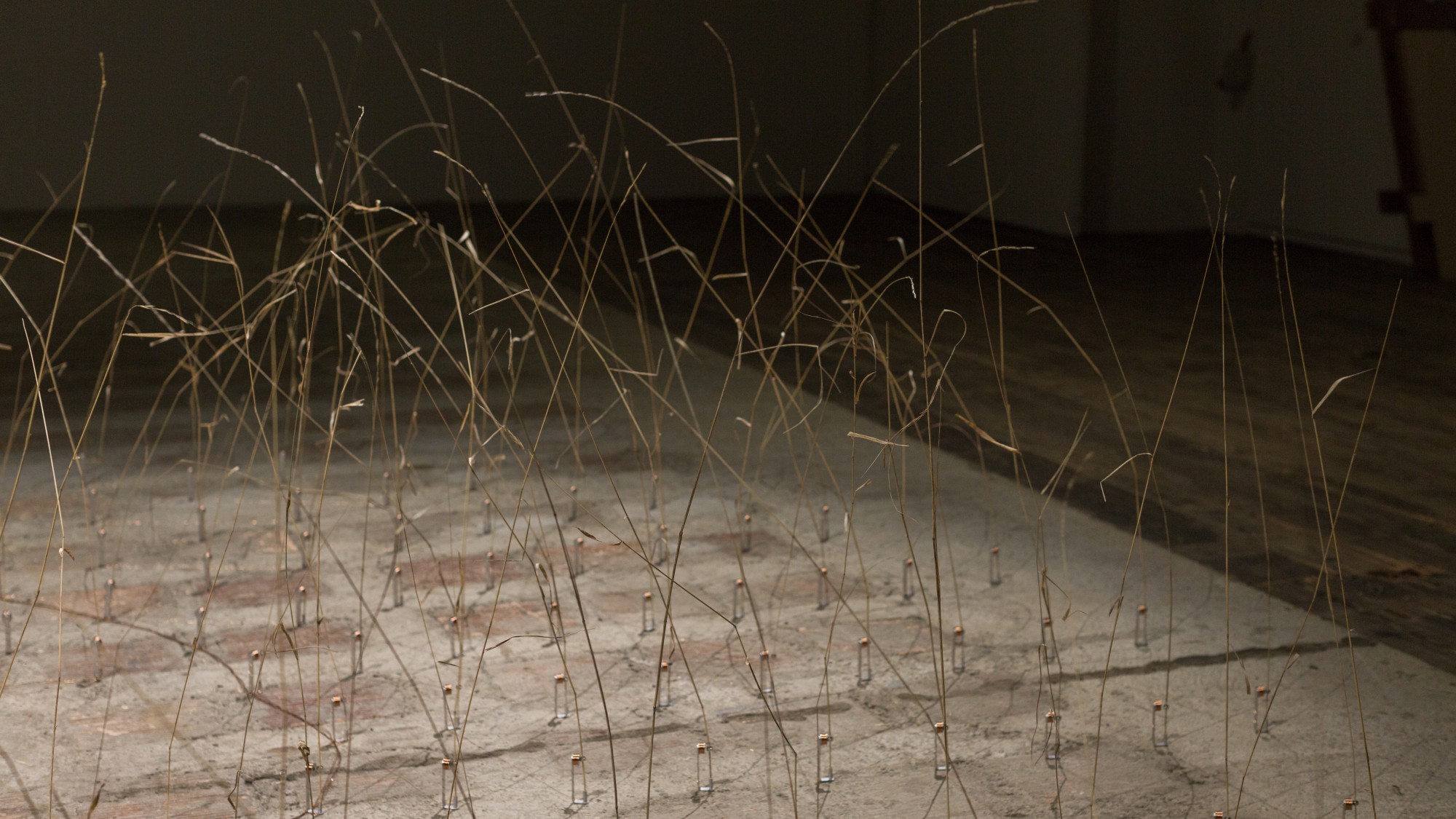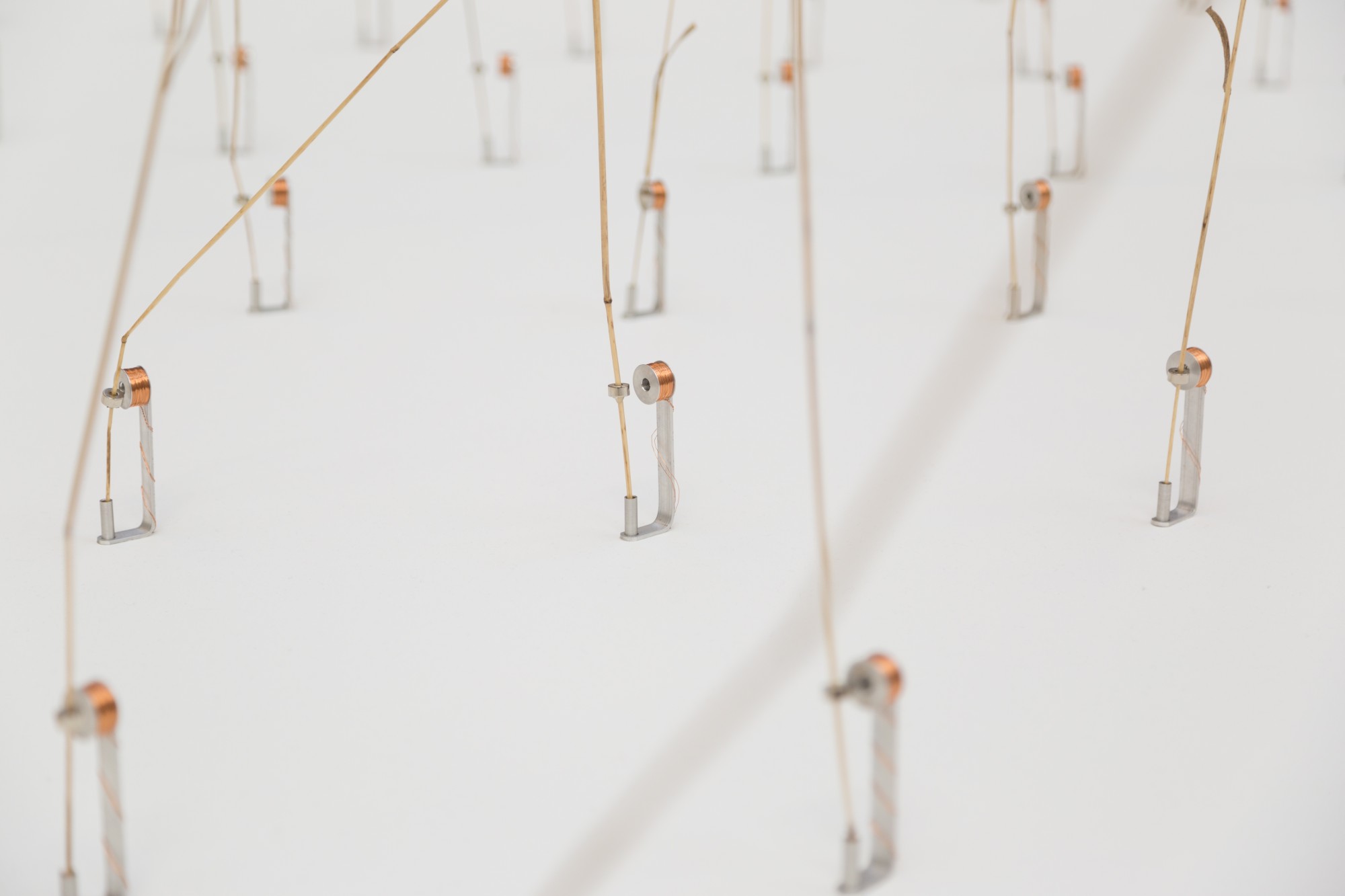Ce sont 162 brindilles d’herbes hautes qui sont mises en vibrations aléatoires par un système électromagnétique simple. La base est faite d’une bobine de fil de cuivre, et la tige est montée d’un aimant cylindrique.