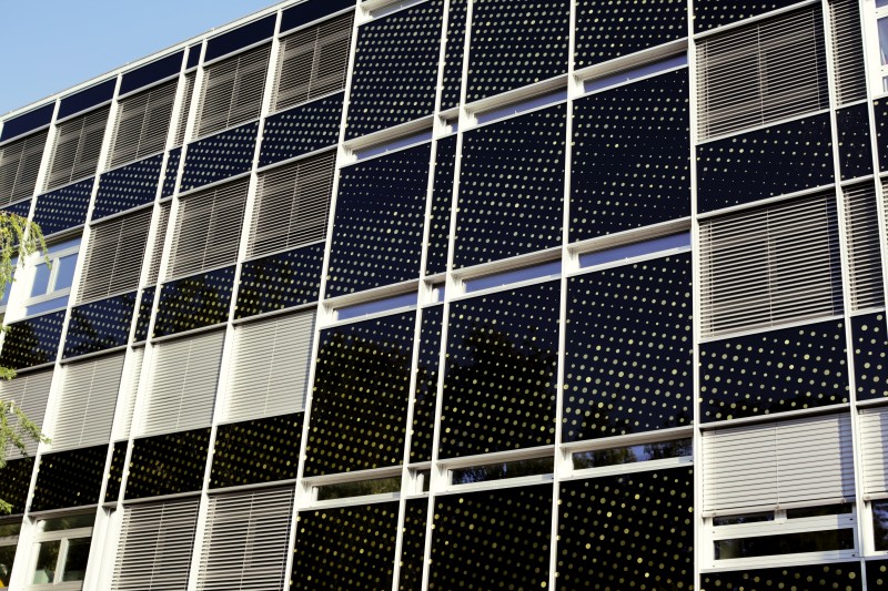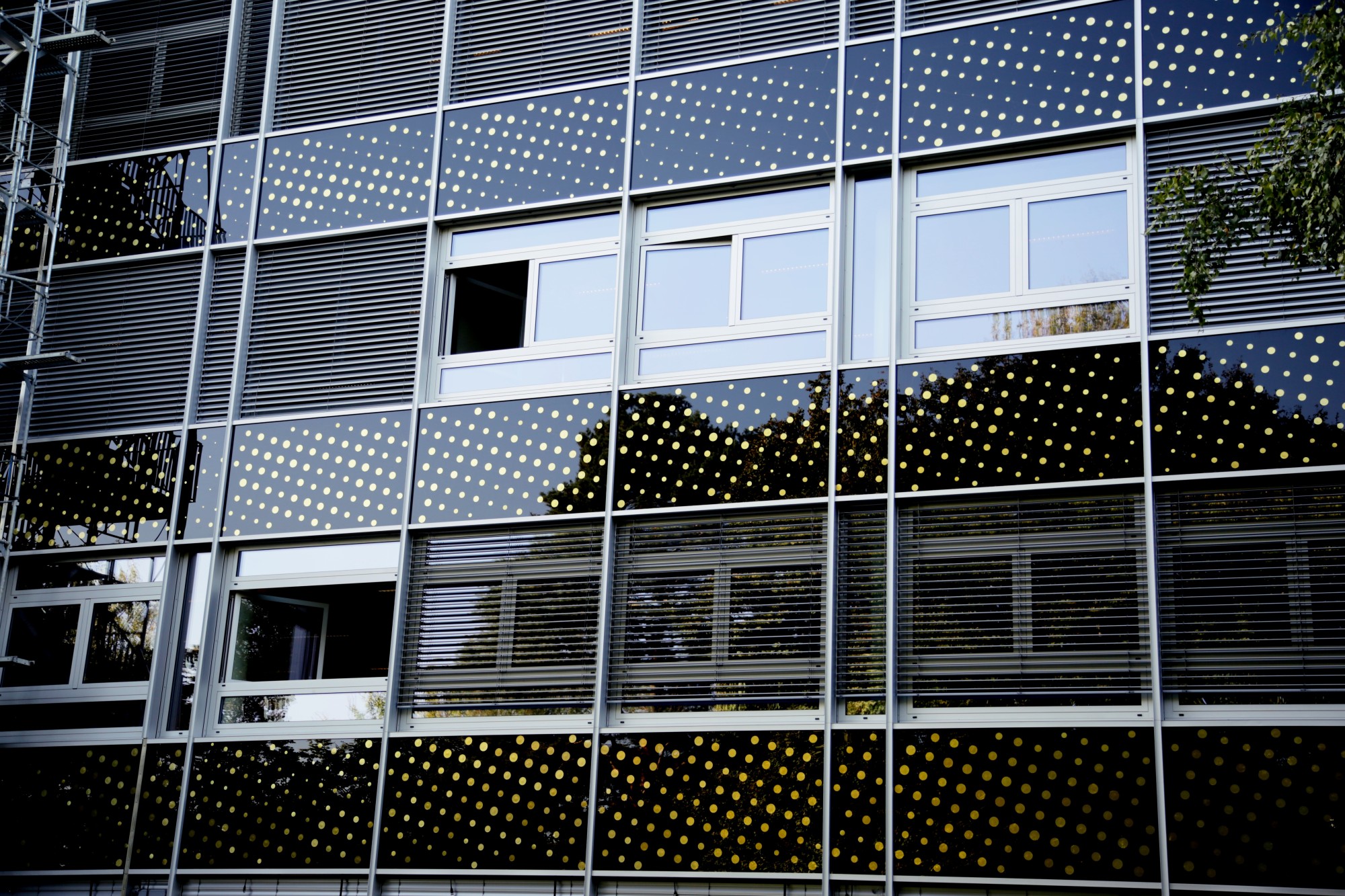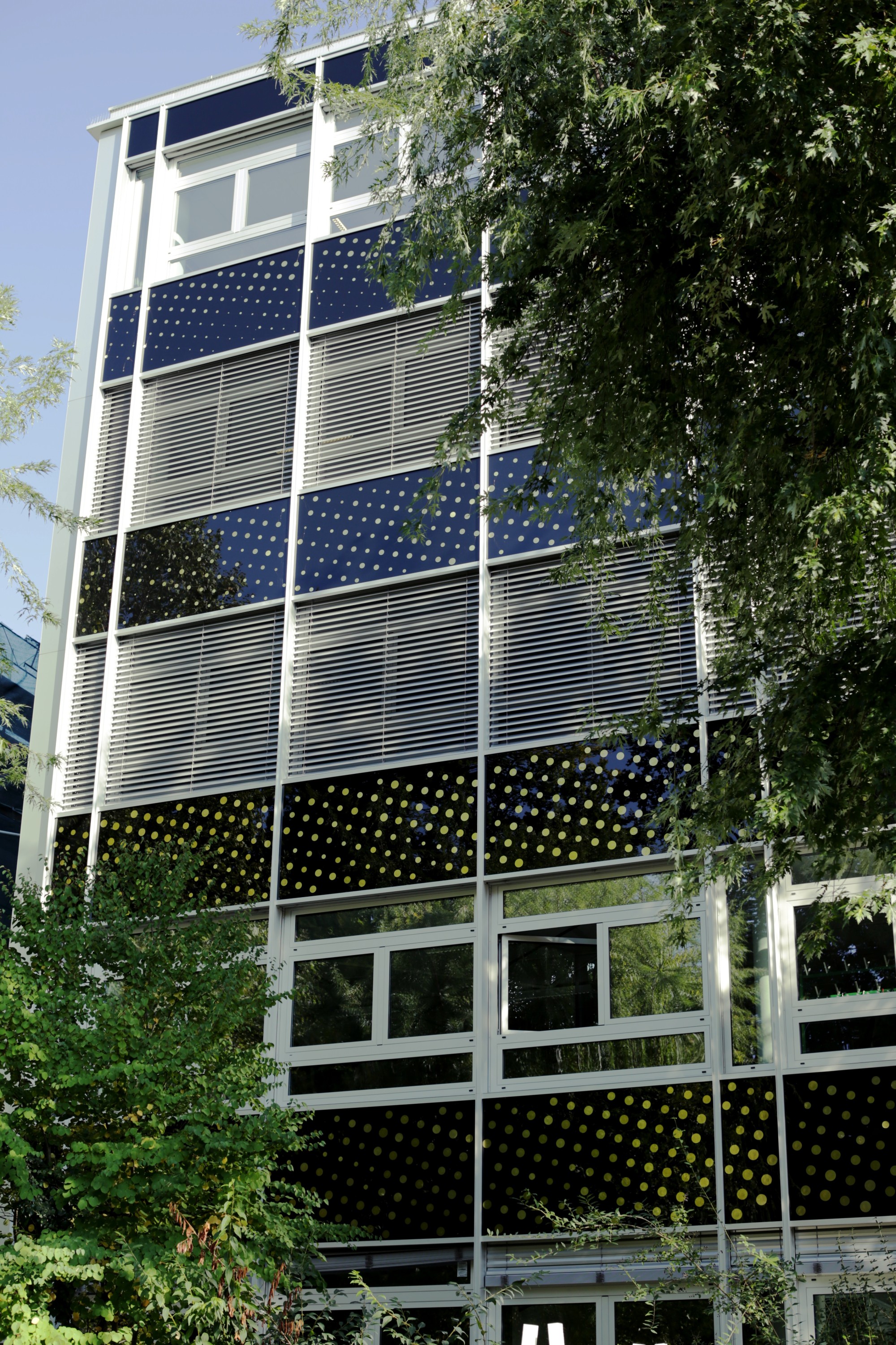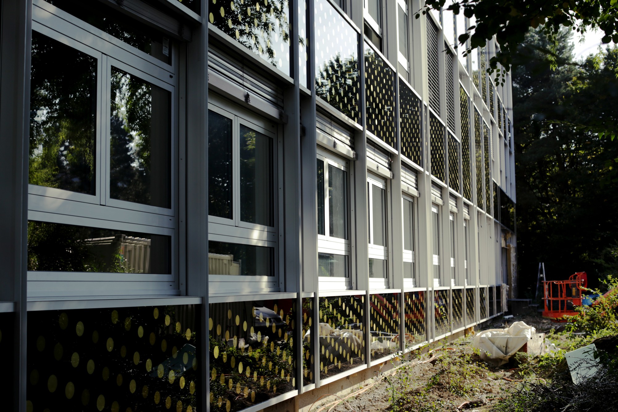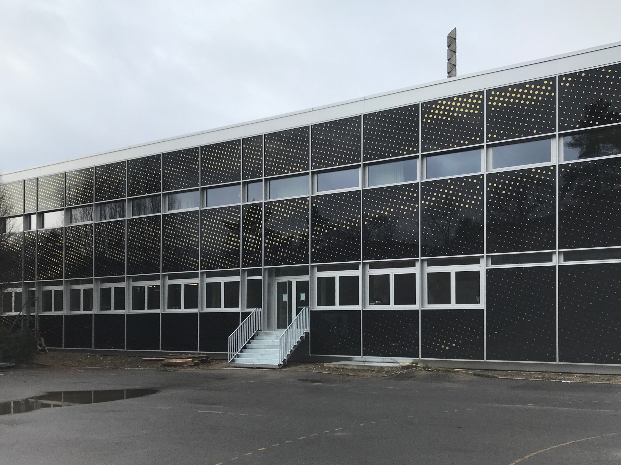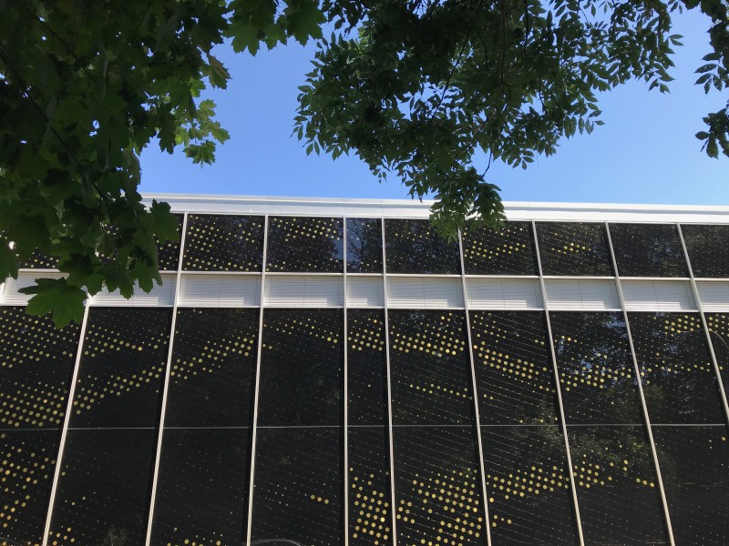 Près de 10’000 mini haut-parleurs piezo sont intégrés aux verres de contrecœur sur les façades est et ouest en longueur des bâtiments de l’EPCL et du Centre Sportif de la Vallée de la Jeunesse. Par la variation de leurs diamètres, ils constituent une trame visuelle organisée par une image réelle et unique.